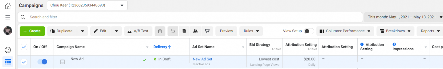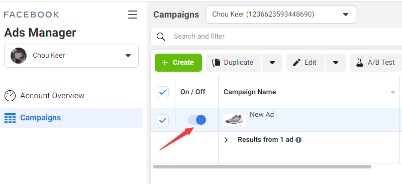1. 登录您的 Facebook 帐户并点击左侧的广告管理器。